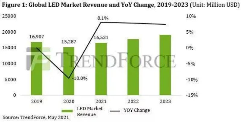 据集邦咨询(TrendForce)全球 LED 市场调查报告数据显示:预计 2021 年全球 LED 市场收入将达到 163.5 亿美元,相比去年增长 8.1%,其中有一项增长就来自于户外LED显示屏。由此可见,户外LED显示屏的市场需求依然可观。